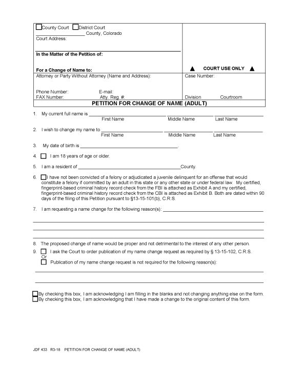 Individuals who have been convicted or charged with a felony can still apply for a name change using the Petition for Name Change for a Prior Felon form. The court may approve the name change, provided that specific requirements are met.[1]