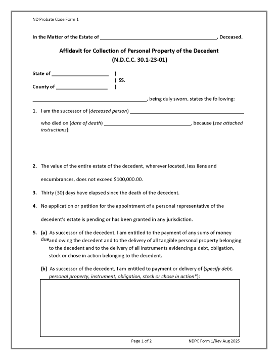 To collect motor vehicles, the affiant will also need to complete and notarize the Affidavit for Collection of Personal Property of the Decedent (Form SFN 2916). The form must be filed at a North Dakota Motor Vehicle office, which can be done by booking an appointment online or calling 1-855-633-6835.