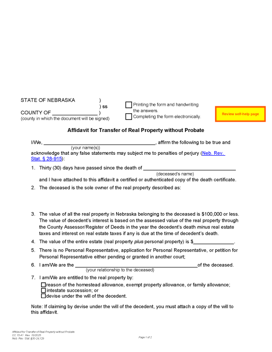 Nebraska small estate affidavit allows eligible successors to obtain the personal property of a deceased person and avoid probate. The form can collect assets as soon as 30 days after the date of death if the estate is valued at $100,000 or less. In Nebraska, the document is called an “Affidavit for Transfer of Personal Property without Probate (CC 15:40)”.