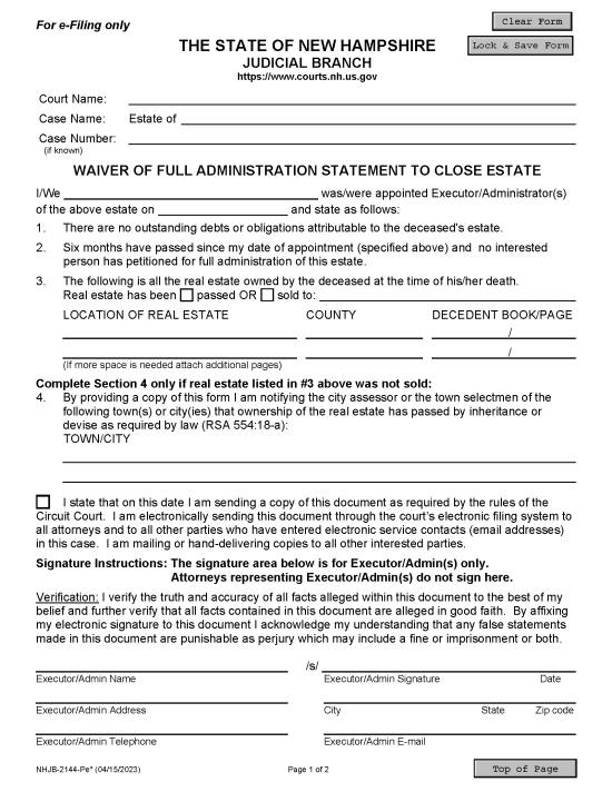 A Waiver of Full Administration Statement to Close Estate (Form NHJB-2144-Pe*) may only be used if there is no other petition already made for full administration of the estate. The court can determine if it is appropriate, or one of the following must apply[2]: