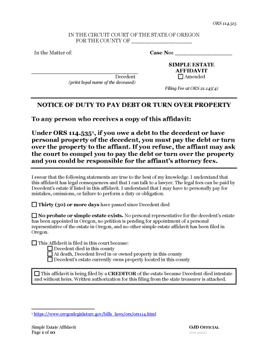 The affiant will need to complete the Small Estate Affidavit, identifying the decedent’s heirs and creditors, along with any claims or expenses against the estate.