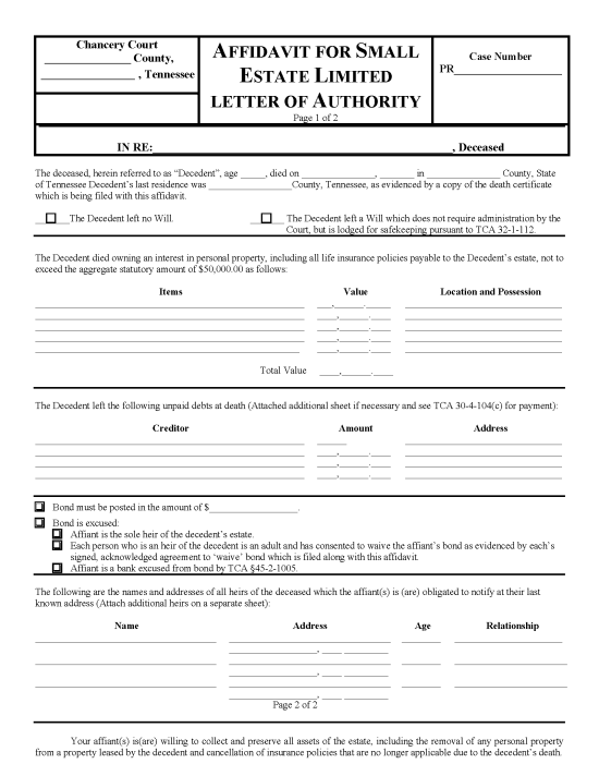 An Affidavit for Small Estate can be used if the estate value is under $50,000 and 45 days have passed since the decedent’s death. The Affidavit cannot be used for real estate or if a petition has been filed for the appointment of a personal representative.[4] The court may waive the 45-day waiting period requirement if good cause is shown.[5]